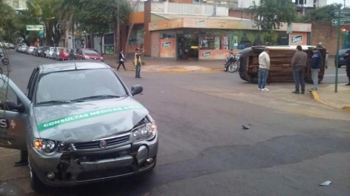 Un automóvil marca Fíat y un utilitario Peugeot, chocaron esta mañana en el microcentro de la capital de Misiones, causando el vuelco del segundo vehículo involucrado.