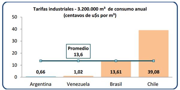 El CERES indicó que en Uruguay se paga entre 1,12 y 1,49 dólares por metro cúbico, según el nivel de consumo, mientras que en Chile el rango va de 0,74 a 1,14 dólar. Sólo grandes productores y exportadores, como Bolivia y Venezuela, pueden exhibir precios inferiores a los de la Argentina.