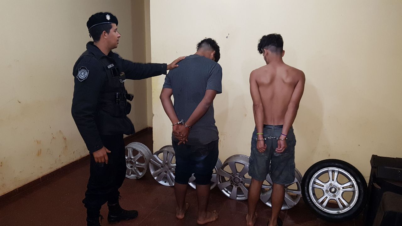 Inmediatamente los efectivos acudieron al lugar y detuvieron a Alexander G. (18) y Matías R. (23) quienes en una zona de malezas abandonaron 06 llantas de aleación de diferentes marcas de los que no pudieron justificar su procedencia.