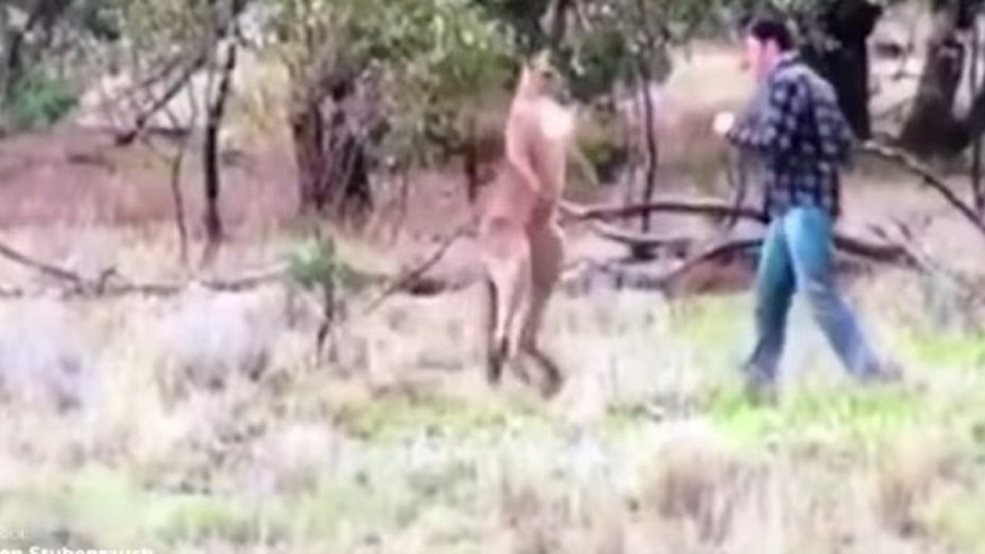 El canguro se queda parado y observa atónito la situación. Finalmente, pasados unos segundos, da media vuelta y se va.