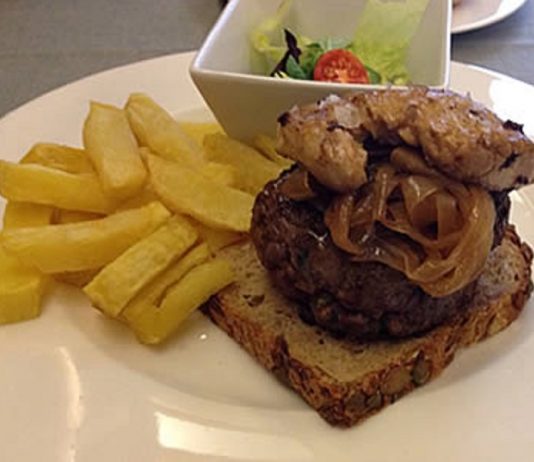 Hamburguesa con cebolla caramelizada y foie a la plancha