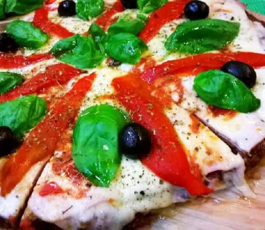 Pizza de albahaca, morrones y jamón en masa de carne